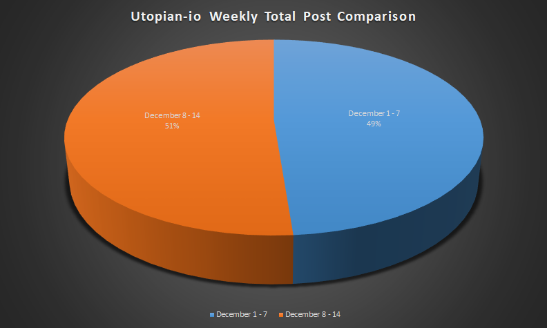 - The analysis features the posts, votes, payouts, and comments (December 8 - 14) of #utopian-io posts and make some analysis comparing to the same results from its previous week (December 1 - 7).