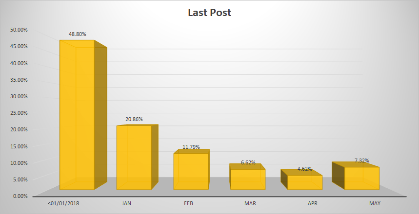 77,961 users have their accounts reading 1st Janaury 1970 as their last post date meaning they have NEVER posted on steemit. That is a whooping 48.80% meaning most people after registering never post again ( they may actually be logging in to read and probably vote on other post, that i cannot verify)