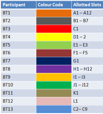 When staking slots are being allotted on the staking grid above, participants such as the DTraders, denoted with BT1 – BT12 are all given one staking slot from a cell. A DTrader can be allotted a maximum of one slot on a cell, and a maximum of 12 slots from a single block such as the case of BT1 being allotted slots A1 – A12. The grid, cell and the slot ID must be clearly stated in DcoinCode contracts where allotting is done