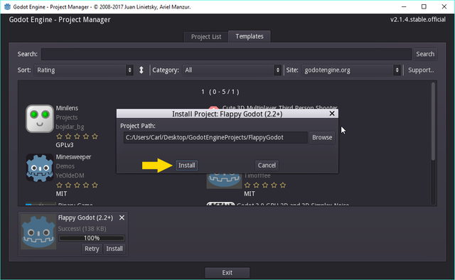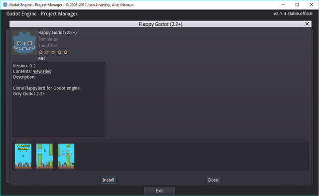 Click the icon next to the Flappy Godot entry. The following screen will show: