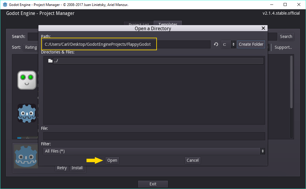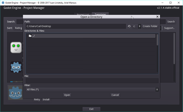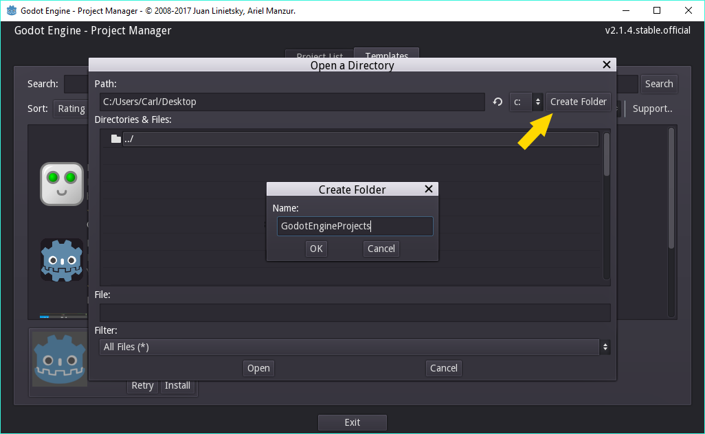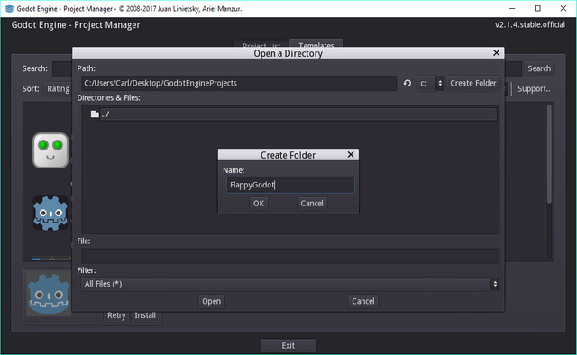 When ready, click create Folder button and create enter a name of your choice, i.e. I've used GodotEngineProjects.