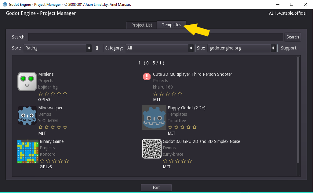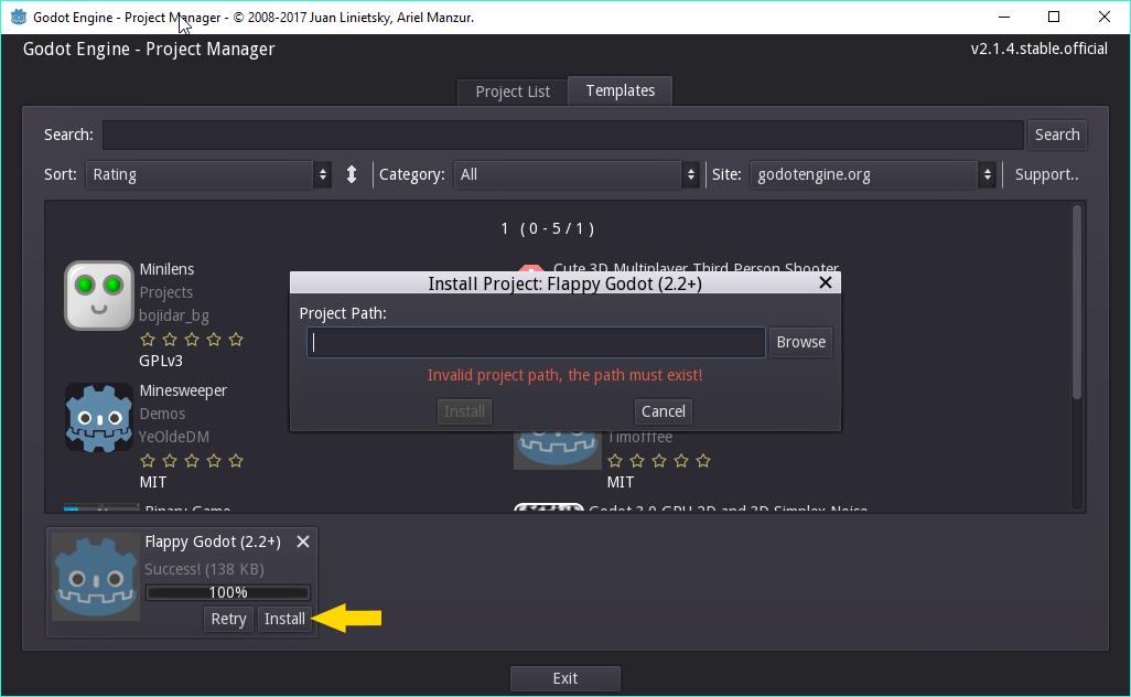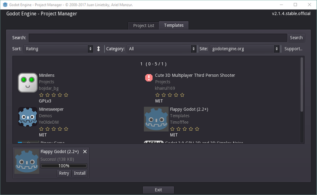 Many templates should become available to you. Have a scroll through them, but return to the first page when done, as we are going to focus on Flappy Godot sample; the second project on the right of the first page of templates.
