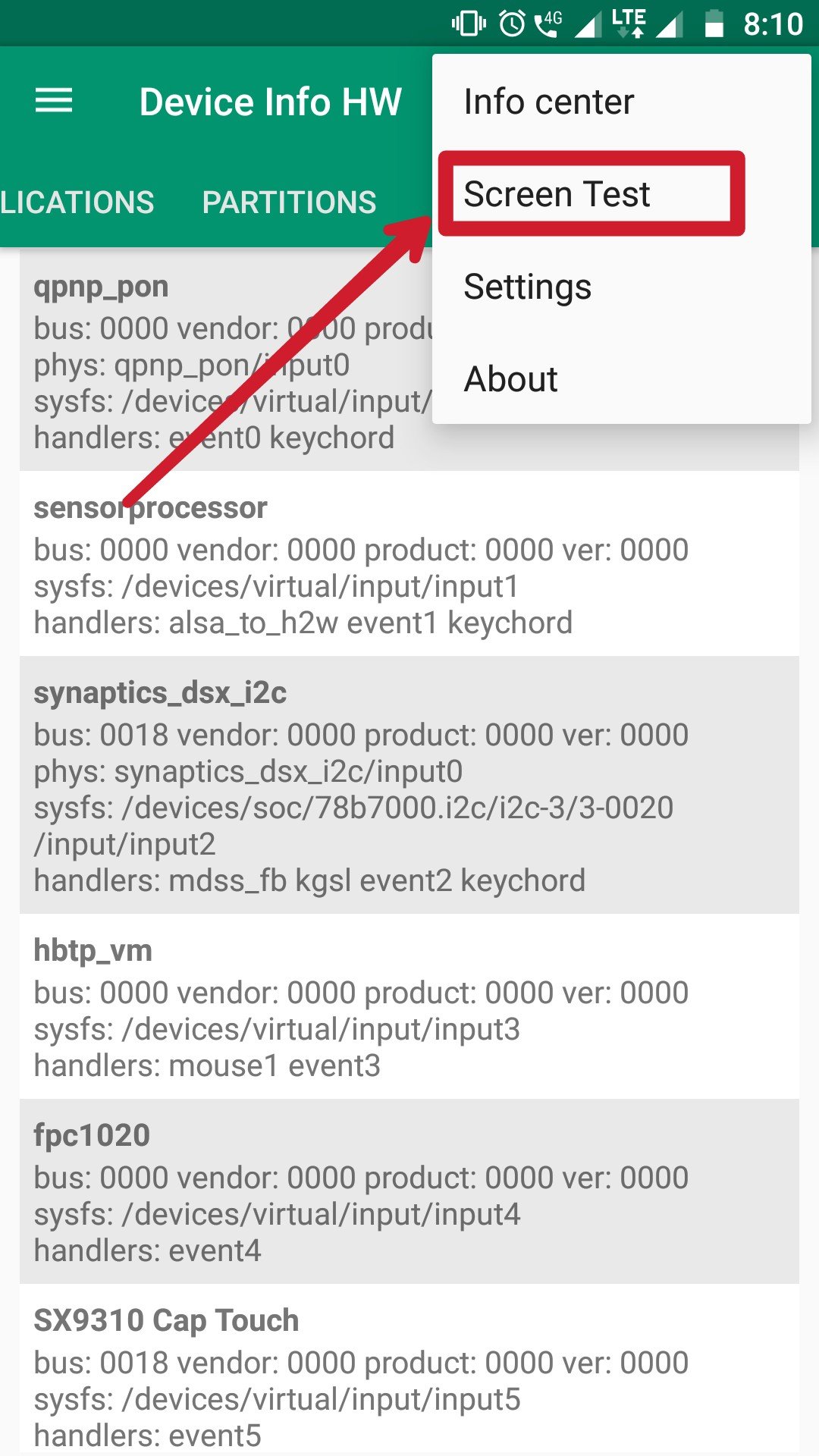 By clicking on the three buttons located at the top right corner of the screen you can get access to options like Info center, Screen test, Settings and About.