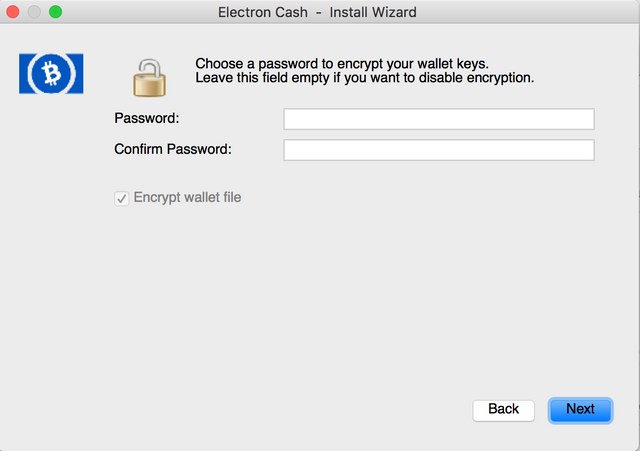 Next, insert an optional password to encrypt your new wallet. We recommend encrypting your wallet with a password.