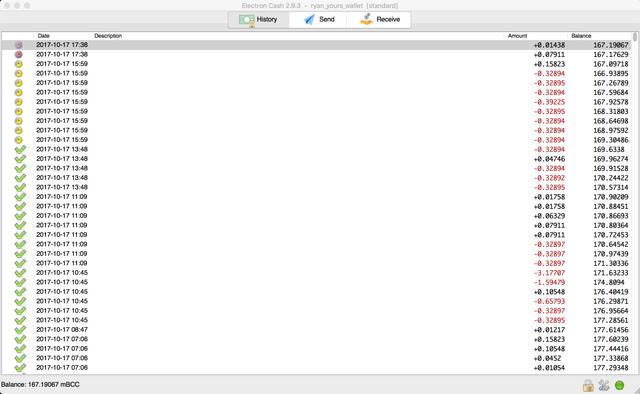 Next you will see your wallet. It will take a few minutes to synchronize. After it synchronizes you will see your full balance and all your Yours transactions in Electron Cash.