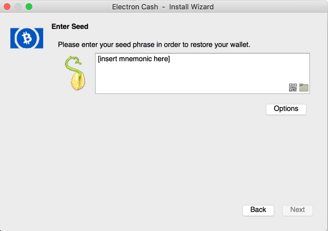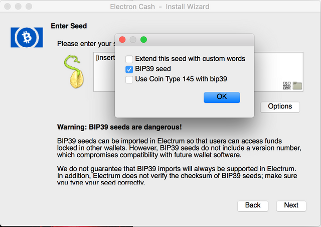 Before you can continue, you will need to click "options" and then choose "BIP39 seed". Leave the other options unselected.