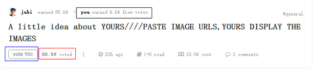 The black area shows you the money you spent, or the money you earned, the blue area is the vote button. and the red area shows you the total votes.