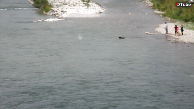I was standing at the Brudermühlbrücke (Brudermühl bridge) when I saw this dog fetching a stick in the middle of the river.