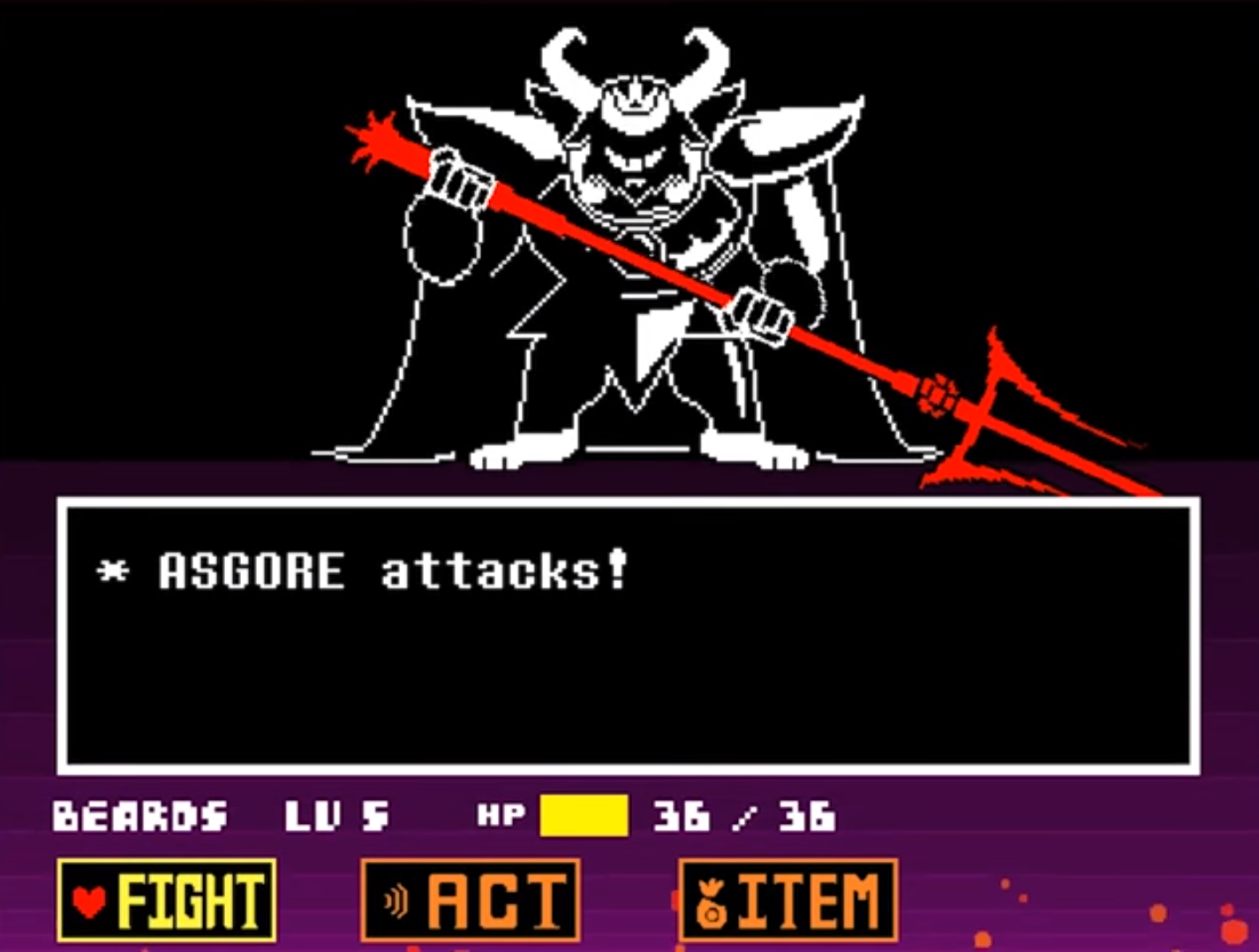 Not only does this seem out of place in the narrative, the battle also represents a major difficulty spike for Pacifists who aren't properly equipped. To compensate, a Pacifist is allowed to speak to Asgore to decrease his Attack and Defense, but that seems like a band-aid for the underlying issue; logically, the battle shouldn't even happen for a Pacifist who managed to spare Toriel. Fortunately, Asgore can be Spared once his HP reaches a certain point, but that doesn't change that you had to Fight him to get to that point.