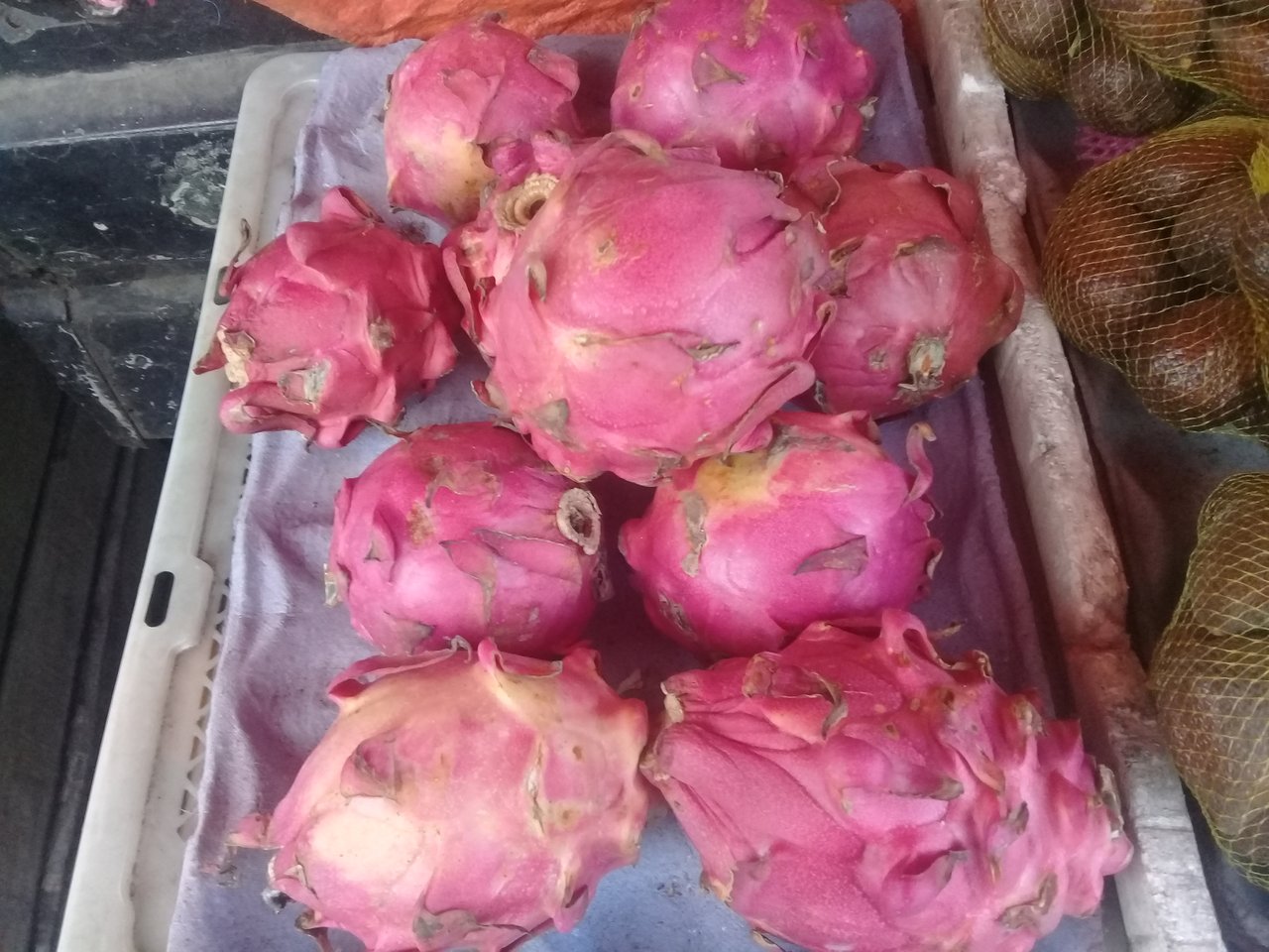 In my area this fruit is commonly called dragon fruit, dragon fruit there are many types and you see this is a dragon fruit fill purple fruit fruits, this fruit is very tasty if used as juice.