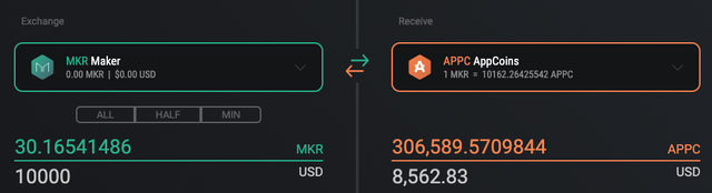 - On the left, select the cryptocurrency you wish to trade and on the right select the cryptocurrency you wish to receive. For our example, we want to trade 10,000 USD worth of Maker and Exodus offers to provide 8,562 USD worth of AppCoins in return.