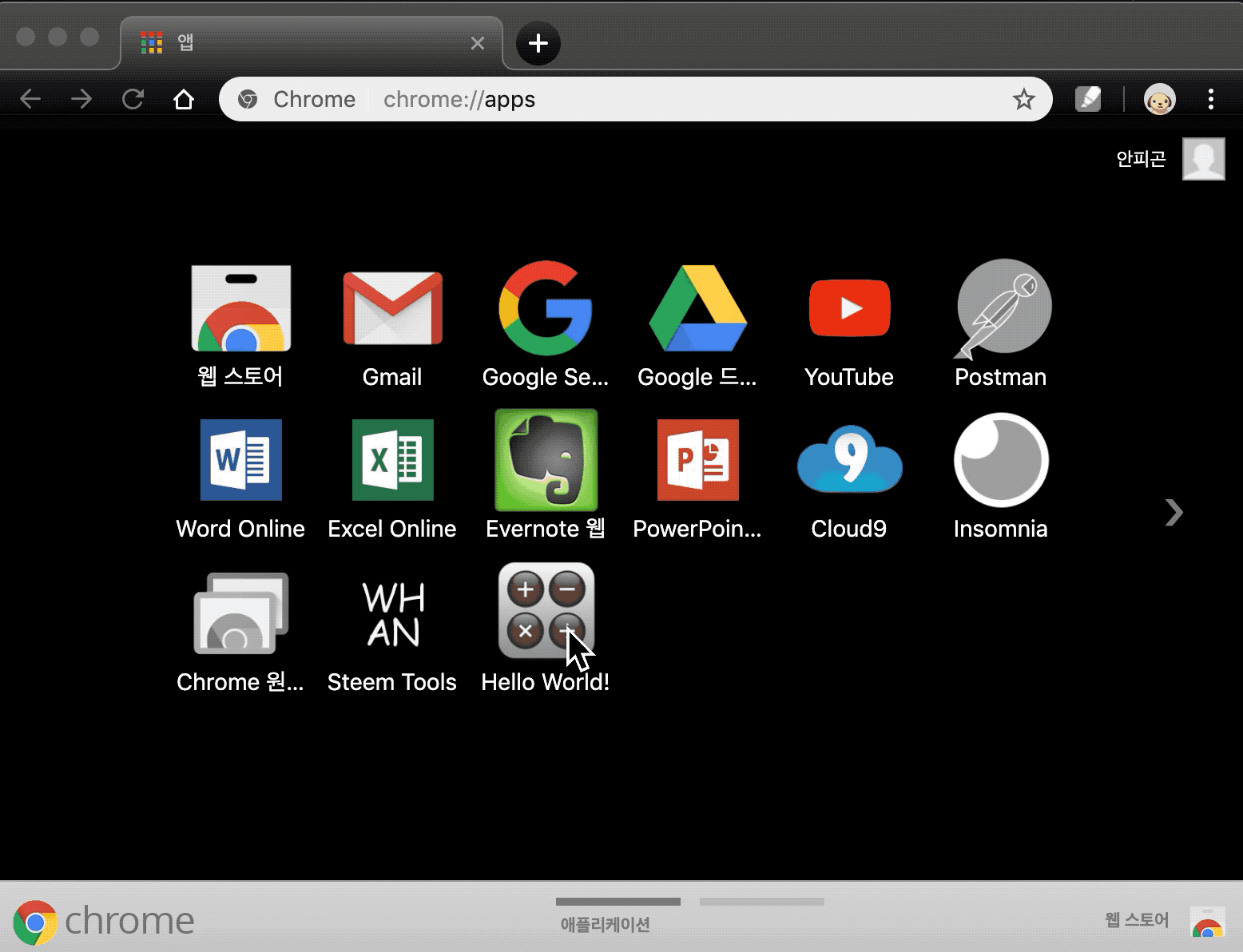 그러고 나면 Chrome Apps 에 Hello World 아이콘이 생성된 것을 확인할 수 있습니다. 클릭하면 앱이 실행됩니다.