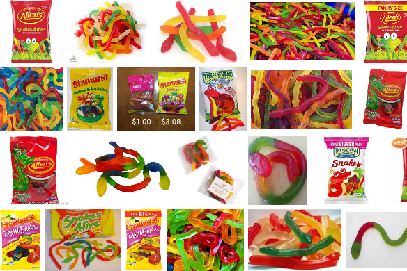 haha, we have all types of candy here, including eyes and other body parts along with spiders but they are more Halloween treats, snakes are available all year round, they look too cute, dopey or tasty to scare the kids haha...