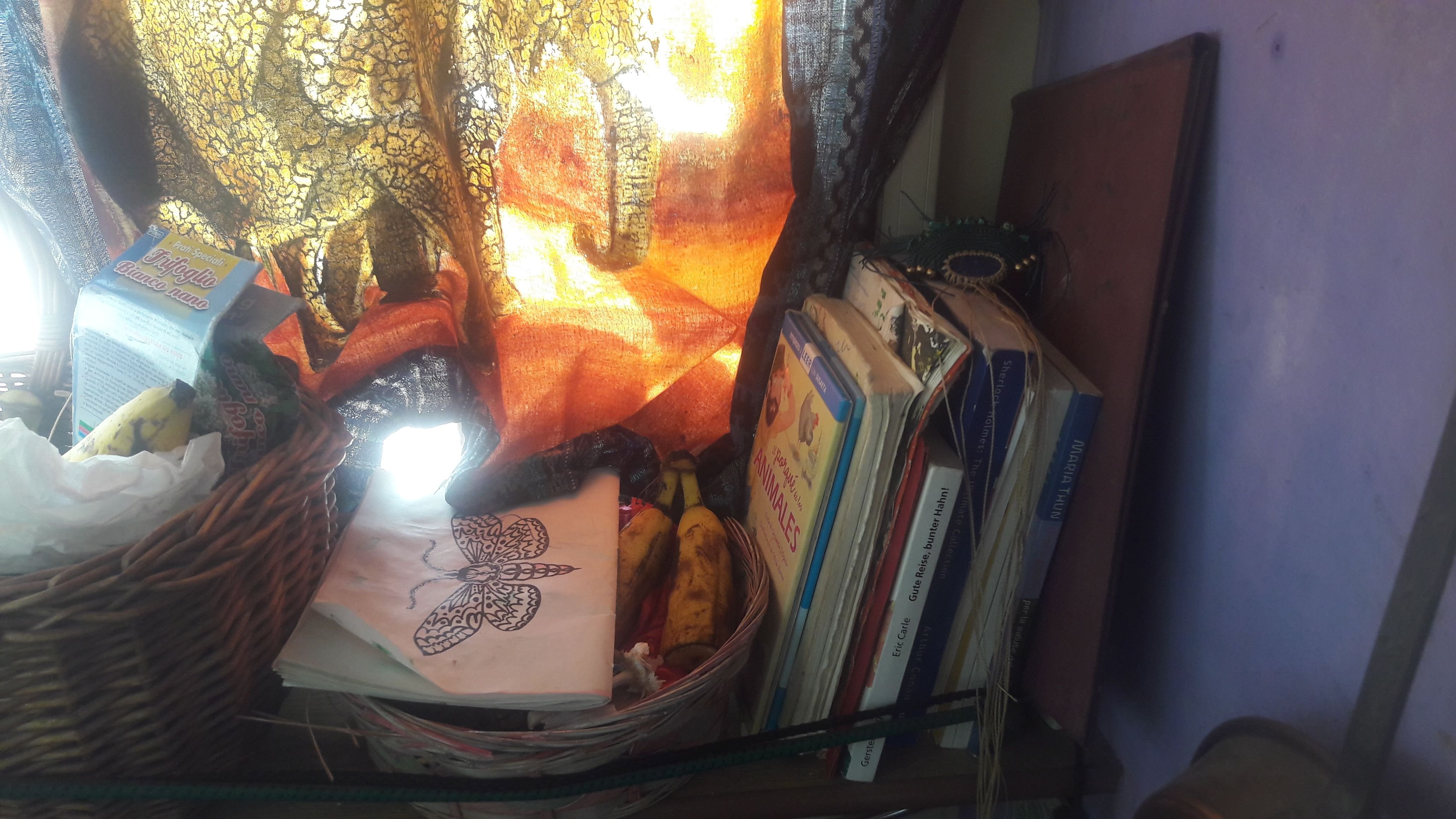 I got no library at all - while traveling - although a woman in Spain gave me a bible - and I wasn't able to refuse it - and I brought a Portuguese book along. These days, I 'write' more than I read (if I don't count reading from screens), although I love reading.