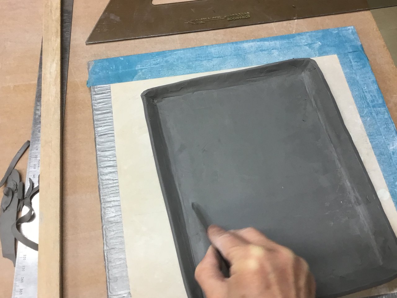 As you may know I work in clay and have a history of showing my process. I plan to use a combination of glaze painting and 3-dimensional elements to make a sort of collage-like piece. First I made a slab of clay using a white earthenware and added little frame like edges. Here I'm smoothing it: