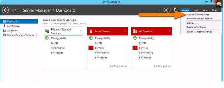 Firstly we need to add the new role to Windows Server 2012, using Server Manager, click the Manage menu, and select Add Roles and Features.