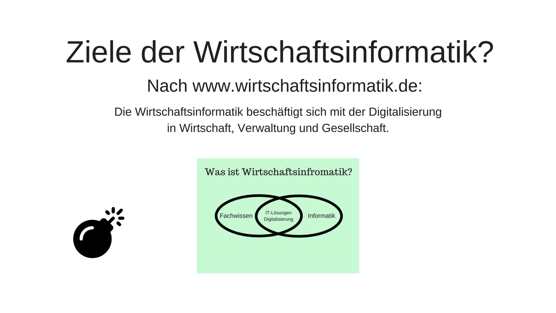 Genau hier wird eine Verbindung zwischen fachlichen und individuellen Anwendungsmöglichkeiten mit den entsprechenden IT-Lösungen benötigt. Dafür gibt es die Wirtschaftsinformatik. Sie beschäftigt sich mit der Digitalisierung in Wirtschaft, Verwaltung und Gesellschaft. Fachliche und individuelle Anwendungen, welche digitalisiert Ablaufen sollen, brauchen eine Umsetzung und diese wird von der Wirtschaftsinformatik erledigt. Das Ziel der Wirtschaftsinformatik ist grundsätzlich die Vollautomatisierung. Da dies momentan ohne weiteres nicht einfach möglich ist, beschränkt sie sich darauf Prozesse zu digitalisieren.