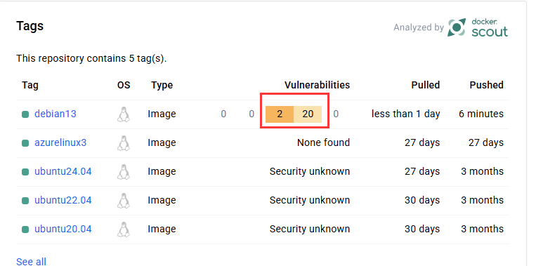 However, the docker hub shows some vunnerabilities for the debian13 images. I'll address this.
