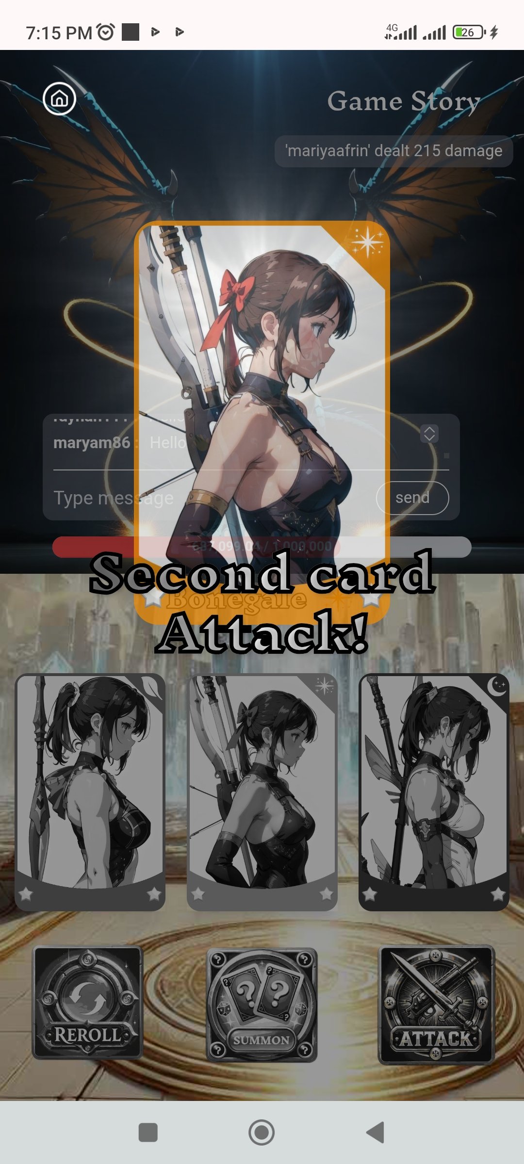| I click on the summon option to attack the monster a second time, and as soon as I click, three cards come out again.Each summon card has its card type, rarity, and damage listed against it.One surprising thing today is that when I attacked the monster for the second time, I got two legendary cards with damage of 100 and 100. |
