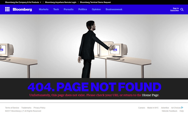Bloomberg's 404 error page displays an animated picture of an angry man who crashes a computer and then disintegrates himself.