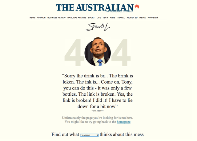 A 404 error page for the Australian newspaper includes an explanation of the nature of the error sarcastically and the way some politicians can say it, leaving a choice to pick your favorite politician to explain the mistake to you.