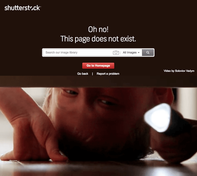 The error report page for the famous raw photo site Shutterstock includes a picture of a woman looking to look for something under a bed or chair with a choice to search the site.