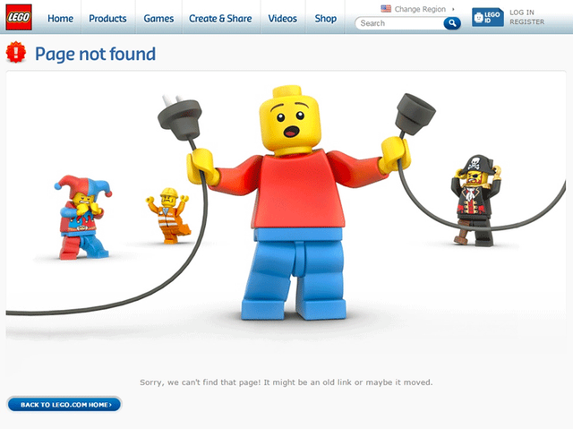 A Lego 404 error page with one of the company's characters holding two electrical outlets disconnected from each other.