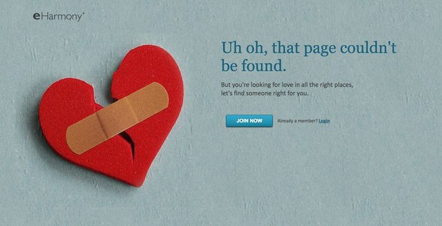 EHarmony's 404 error page for finding the right partners for its servers, including a broken heart with a label and links to return to the main page of the site.