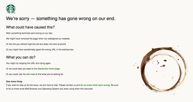 A 404 error page in the Starbucks chain of supermarkets uses its primary content product with a coffee loop that is similar to the effect coffee leaves when it leaks slightly from the edge of the cup.