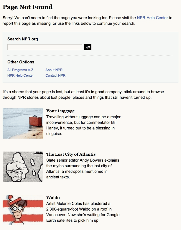 A 404 error page on the US Public Radio Agency site contains links to topics about things people usually look for without finding them like Atlantis or Waldo.