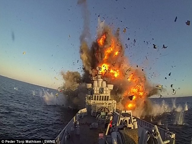 They hastily collected whatever that they could and started to escape the ferry. At that moment, a pirate tripped and dropped a grenade that looked like the ones used in world war 2. The grenade rolled to the side of the boat before exploding, sending many of the passengers tumbling towards the deck. The ship started to split in half as many of the passengers started running towards the life rafts. The pirates started jumping off the ship into the waters below. Some managed to get onto their speedboats and started speeding off.