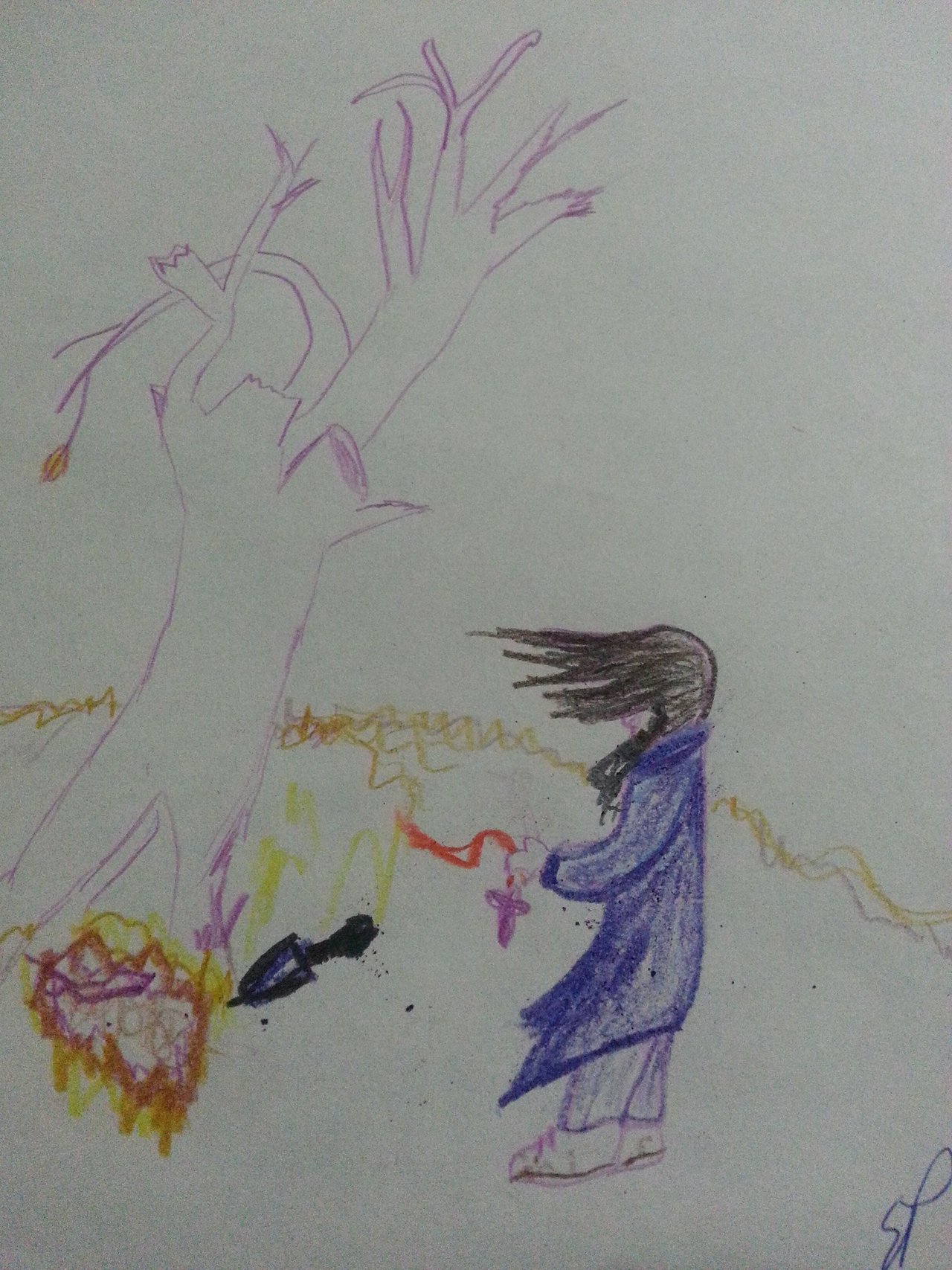 Caecus is standing beneath a tall dying tree in the middle of an empty, brittle yellow field, where a look in the distance of any direction would only bring the sensation of more solitude. The skies are a mix of soft neutral hues, the wind is icy dry and it looks to burns his skin raw, red. He’s looking down into his hands, focusing intently on a rusty silver cross with a carving of the crucified image of Jesus Christ that all together hangs on a lengthy, dark red string of yarn. His eyes threaten to spill diluted secrets at the force of the wind. Perfectly timed, as my neighbors gather closer to watch, his long black hair falls from his tie and rushes to his face while draping over his hands, almost as if to shield these secrets from anybody who may be near. Unfortunately, there are only nobodies here. It seems his body realizes this before he does, he is too lost in thought.