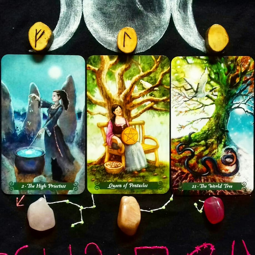 (Card: The High Priestess, Rune: Fehu, Crystal: Rose Quartz)