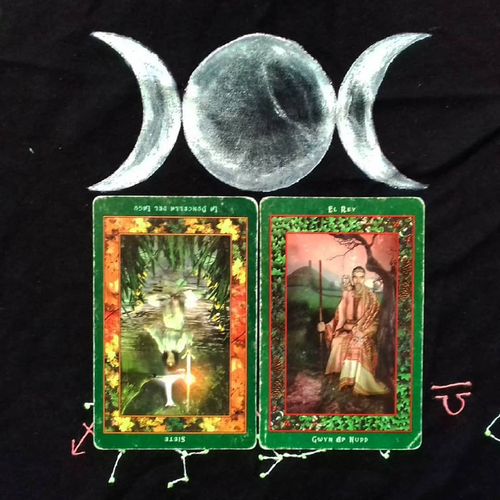 Cards: The Lady of the Lake (Inverted) and Gwyn Ap Nudd, from the Fairy Ring Oracle Deck.