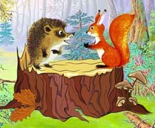 After landing from branch to ground, they embraced and began to discuss how they passed the day, what has happened and what they learned about the forest in which they lived. The forest was bright, there were many trees, but the trees were far from each other. The sun's rays could penetrate everywhere, the forest was filled with light and warmth. Guys heard in the bushes rustling and sounds"Pfft pfft pfft pfft." Before them rolled out on a glade hedgehog , all in the grass with a smile on his face.