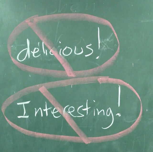 The above photo is a chalk illustration I wrote while teaching oral, conversational English at a university in China. Both the title of this post, and the above photo makes me look like I am against things that are "delicious" or "interesting." Oh dear god, that is so far from the truth. Who the hell ever complains, "I did not like those noodles in a hearty tomato soup! Why? They were delicious!" Or: "Logan was terrible film. Why? It was interesting!" That just doesn't follow. It doesn't make sense. So, why I am so dead set against these words?