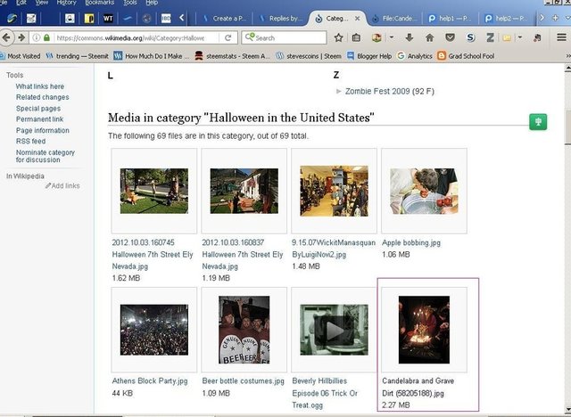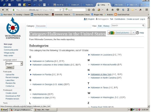 You'll enter whatever subject you want to illustrate your post. I'll go with Halloween for an example The site will return a lot of selections and categories. Take your time and look around for the best pics to go with your post. I explored a bit and found Category:Halloween in the United States