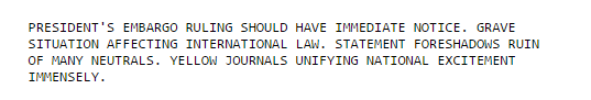 Above is an example of a null cipher, a form of text hidden in text steganography. If you only read the first letter (or any specified letter for other forms), you will find the hidden message that reads: PERSHING SAILS FROM NY JUNE I.