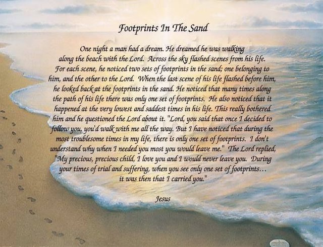 They reminded her of her late friend, Roxanne. She still carried the plasticized card with that biblical "Footprints" poem. She couldn't remember when or why Roxie gave it to her but she had kept it all these years anyway. She wasn't the praying kind nor the church-going type but that card definitely had a special place in her heart.