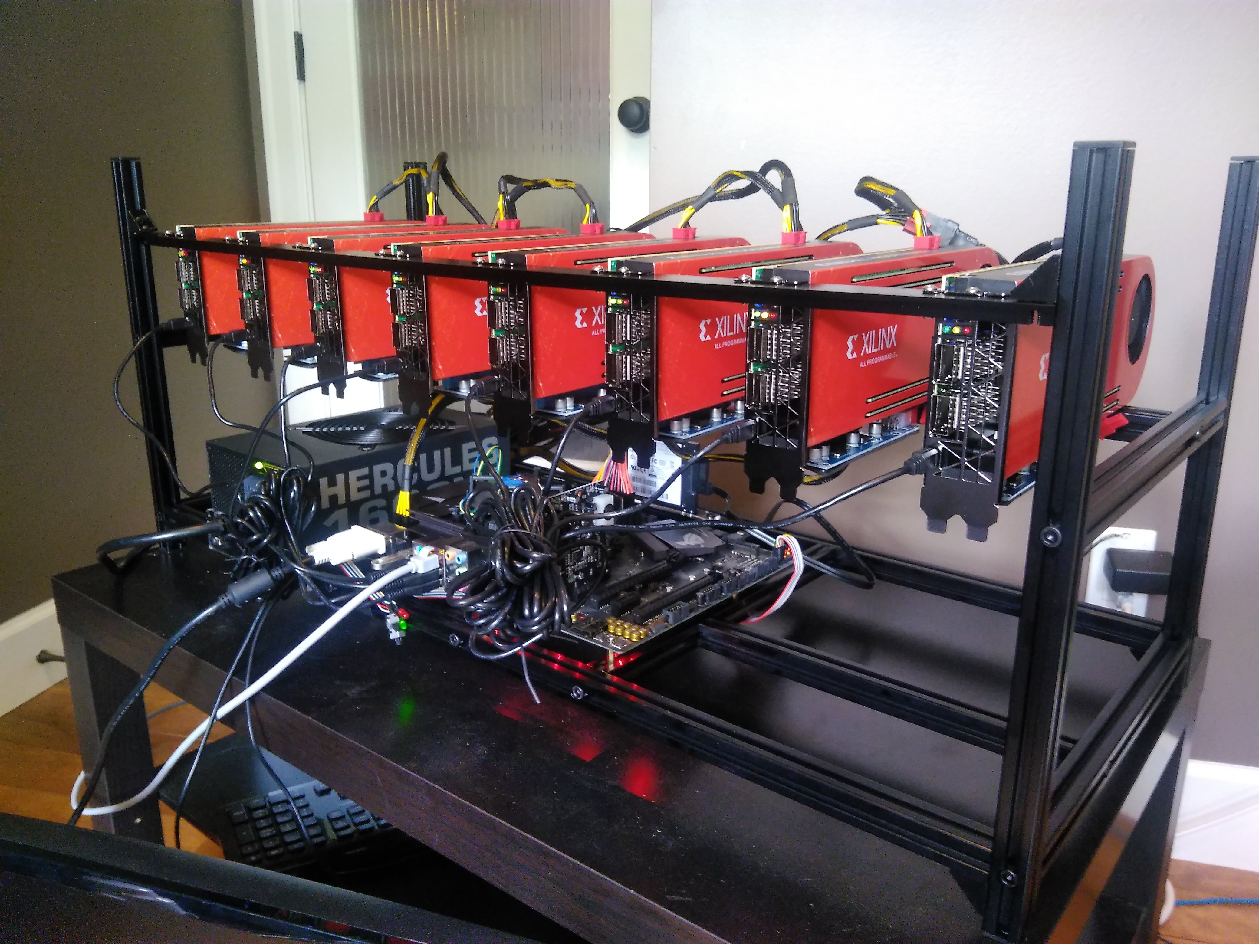 ere are some pics and video of my 8 x Xilinx VCU1525 rig. Each VCU1525 card has one Xilinx VU9P Virtex Ultrascale+ FPGA. Hash rate for the whole rig combined is: