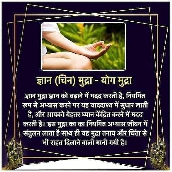 ज्ञान (चिन) मुद्रा- योग मुद्रा ज्ञान मुद्रा ज्ञान को बढ़ाने में मदद करती है, नियमित रूप से अभ्यास करने पर यह याददाश्त में सुधार लाती है, और आपको बेहतर ध्यान केंद्रित करने में मदद करती है| इस मुद्रा का का नियमित अभ्यास जीवन में संतुलन लाता है साथ ही यह मुद्रा तनाव और चिंता से भी राहत दिलाने वाली मानी गयी है|'."