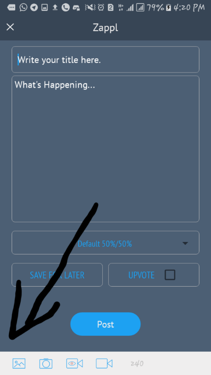You can post pictures, videos or even post live video all on zappl. To post a picture click here on the app