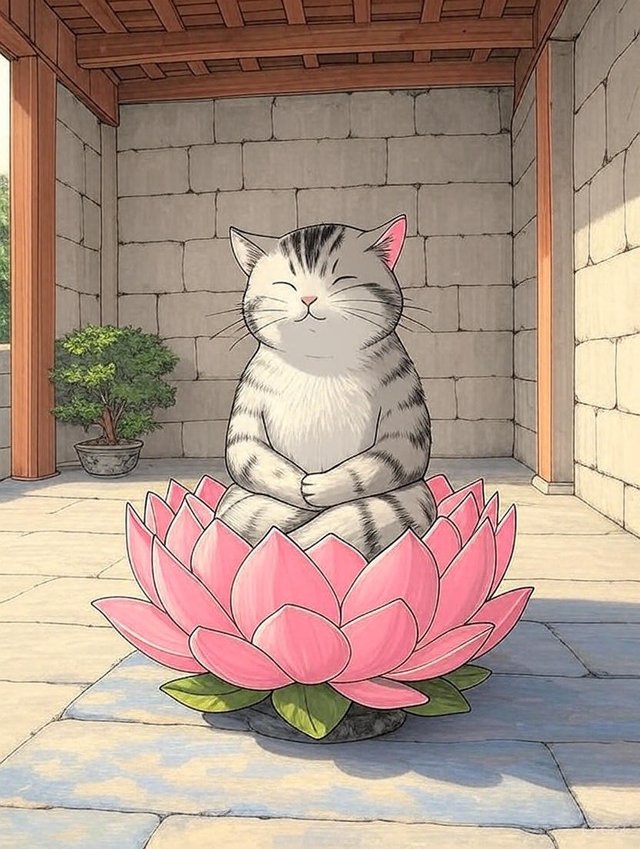 잠시 후, 고양이는 눈을 뜨고 연꽃을 부드럽게 바라보았다.