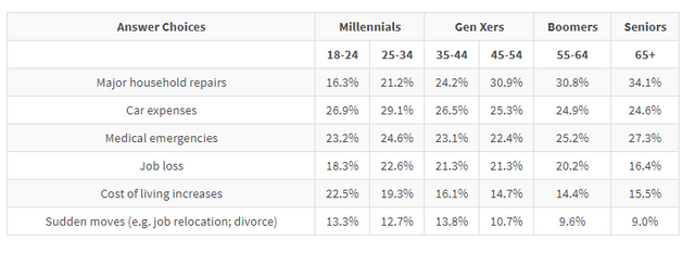 Below is a table of how each age group responded to the survey question, “What situation or reason has made you use money from an emergency savings/fund?”