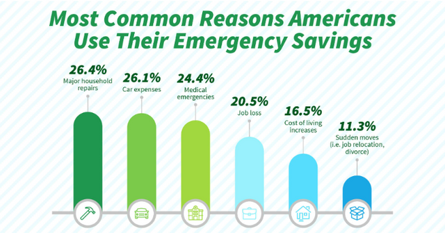 That’s why it’s important to put serious thought into what you should address immediately and what you can pay for over time. If a repair doesn’t require immediate fixing, you might be able to adjust your monthly or weekly budget to find a solution rather than drain your emergency fund. Similarly, if taking public transportation to work means you can fold auto repairs into your normal budget rather than use your emergency savings, that might be a better option. It’s important you define “need” realistically. An enormous hole in your roof is precisely what your emergency fund is for — but remodeling your kitchen might not be. Soure Article: Survey Finds Most Common Reasons Americans Use Emergency Funds